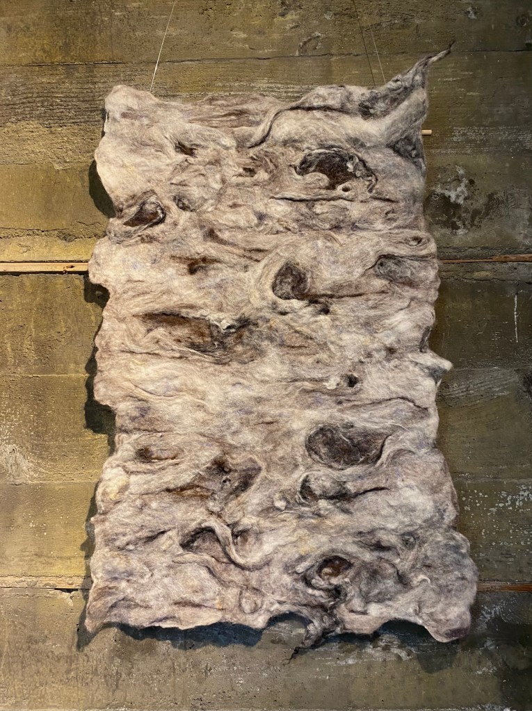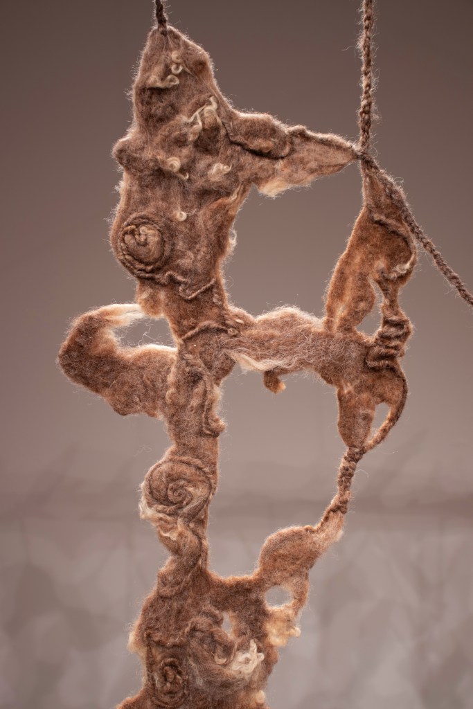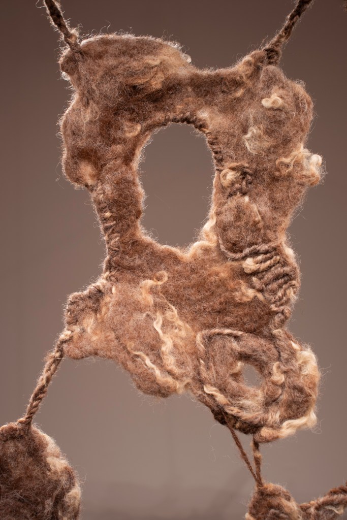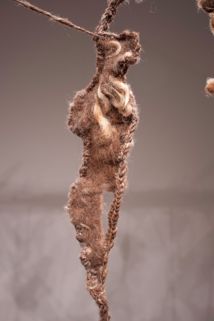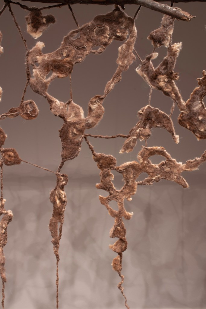 Rubbed Raw Process: Wet felting was used to create the base shapes. Needle felting was used to create density and physicality on each shape. Raw wool was spun into yarn with a drop spindle hand constructed by the artist for this project. Yarn was then crocheted into and around the felted shapes, and used to suspend and bind them to each other. The found branch was cleaned, and processed gradually, so one end is fully processed and the other is fully raw from the forest floor. The most processed end is waxed and buffed.